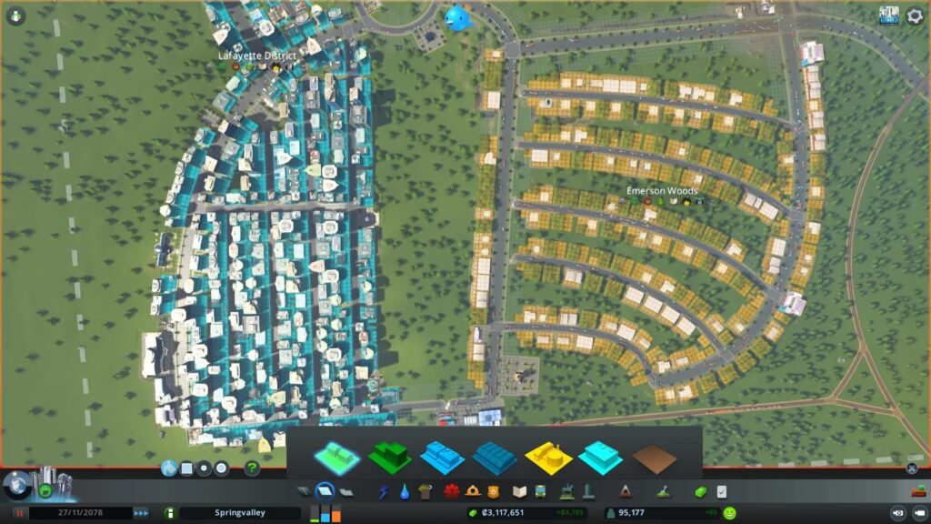 La interconexión eficiente entre zonas residenciales (proveedoras de mano de obra y consumidores), industriales (productoras de bienes), comerciales (vendedoras de bienes) y de oficinas (proveedoras de empleo limpio) es crucial para una ciudad equilibrada y próspera. Una red de carreteras bien planificada, con interconexiones eficientes (como rotondas o intercambiadores) es esencial para gestionar el tráfico de mercancías y trabajadores, especialmente si dependes en gran medida de la importación o exportación.